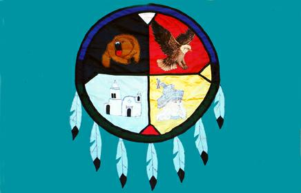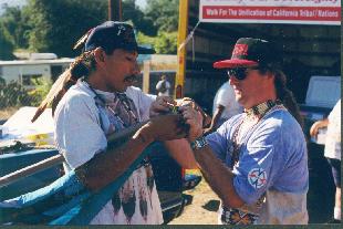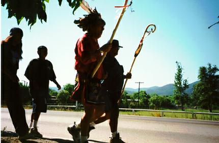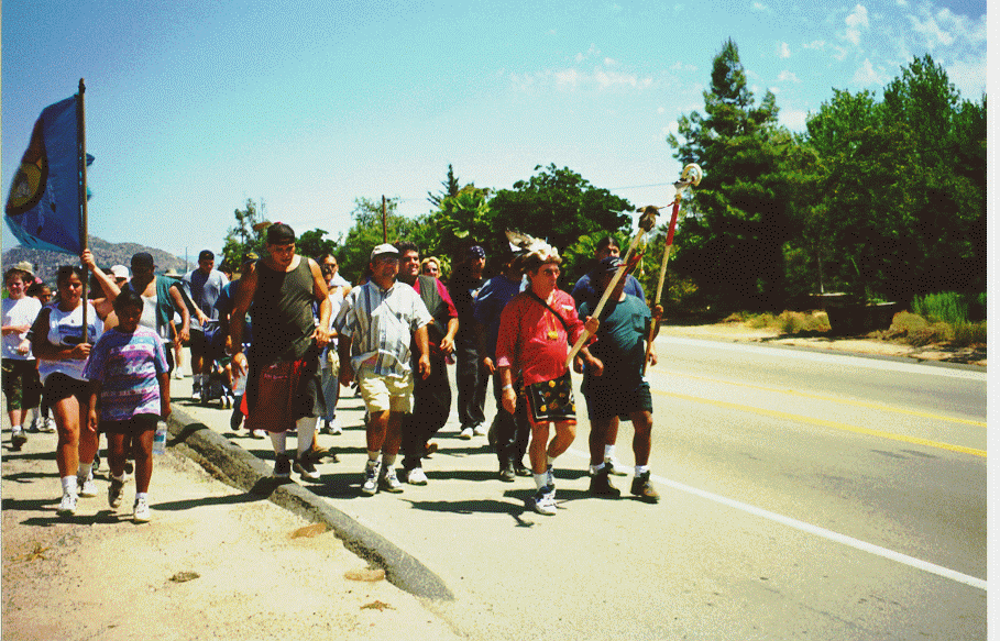 This is one of the tribal flags (not an SOS flag) traveling with the walkers. Someday, there may be a place where all 120 California Tribes could fly their flags as the "United Nations of California Tribes." |