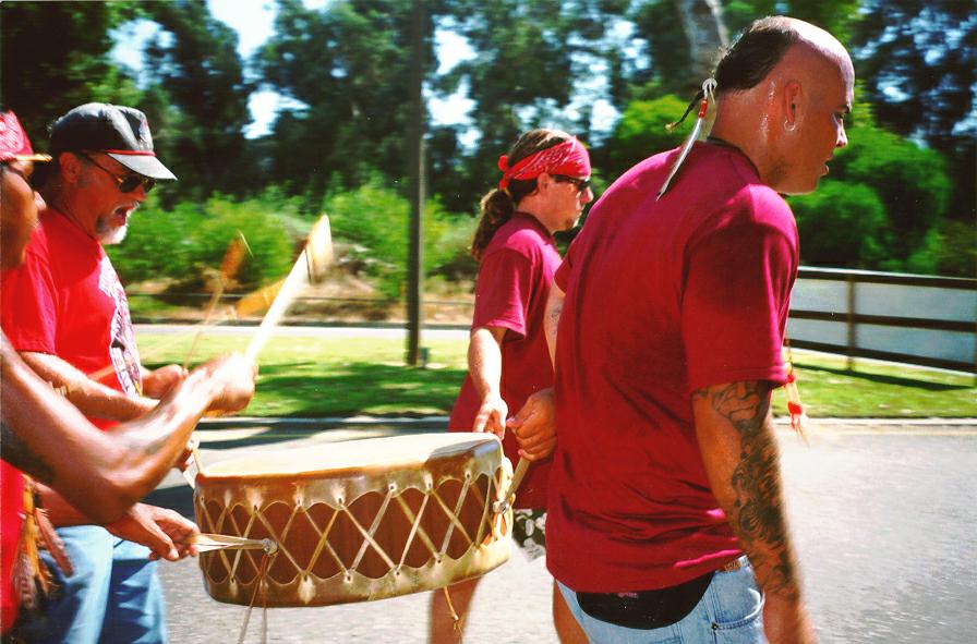 Going through Monticeto, almost to Santa Barbara, the drum is carried behind the staffs while songs and prayers are sung. The beat of the drum, the heartbeat of the people, helps carry the walkers down the road. |