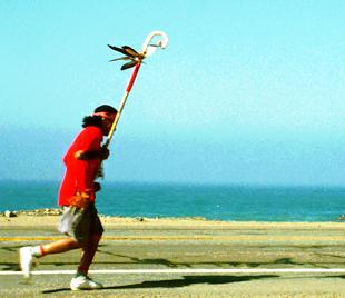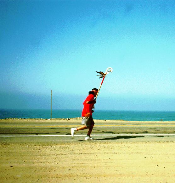 Sometimes we walk, sometimes we walk faster. The Bear staff is a symbol of Unification and is walked by members of the Bear clan all the way to Sacramento. Due to the proper tradition, and ceremonies along the way, it sometimes becomes necessary that the Bear staff be carried by a runner that slows down time. During this time change, the staff is followed by a van with other runners and they are only allowed to change 8 minutes per prayer time. The walkers follow, or shuttle ahead to continue walking. Here Robert carries the Bear Staff along Highway 1, just North of the Leo Carrillo State Beach. |